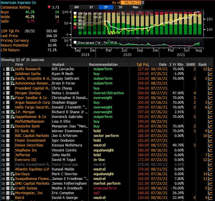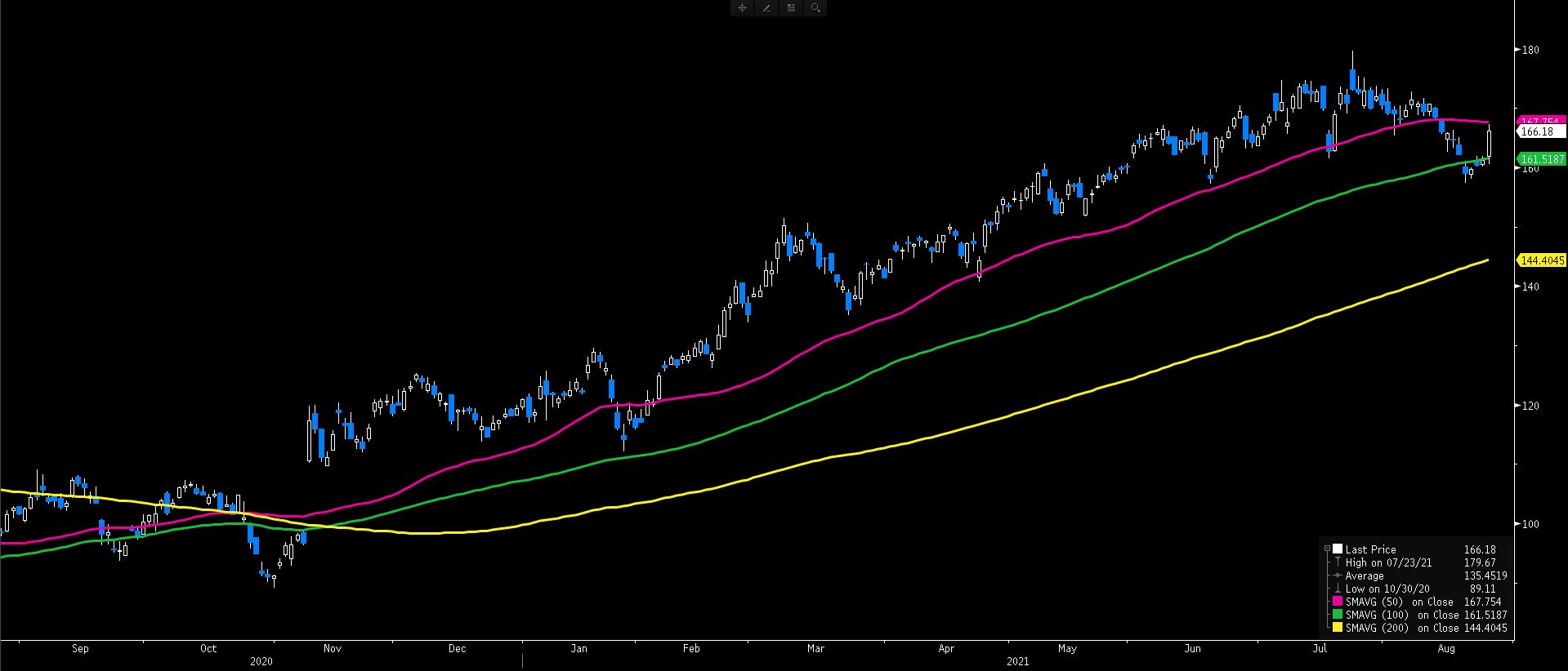 AMERICAN EXPRESS hisse senedi 23 Temmuz 2021’de gördüğü 179.67 yüksek seviyesinden baskılanmasını sürdürmektedir. Aşağı yönde 100 günlük ortalama (161.51) destek olurken, mevcut fiyatlama 50 günlük ortalamaya (167.75) kadar yükselmiştir. Fiyatlama için 50 ve 100 günlük ortalamalar arasında dengelenme devreye girebilir. Yukarı yönde 23 Temmuz yükseğine doğru çıkışlar beklenebilir. 100 günlük ortalamanın kırılması durumunda aşağı yönde 157.33 ve en kötüsü için 200 günlük ortalama 144.40 destekleri devreye girebilir. Analistlerin 12 aylık dönem için hedef fiyatı $183.40 seviyesinde bulunurken, en yüksek hedef fiyat $227.00 seviyesi olarak Bloomberg terminalinde yer almaktadır. (Kaynak: Bloomberg)